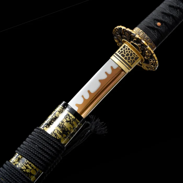 The katana presents a breathtaking visual symphony of black and gold, a color palette that represents mystery, power, and opulence. The black elements of the sword hint at the shadows, mysteries, and the profound depths of the martial journey, while the gold resonates with luxury, royalty, and the high esteem in which the sword is held.