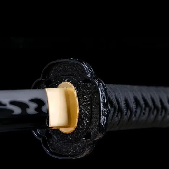 This fully black, dual-colored blade offers a unique aesthetic appeal, featuring a flame-shaped hamon for an added touch of intrigue. This sword, which weighs 1.2 kg, exhibits the ideal harmony of power and flexibility.