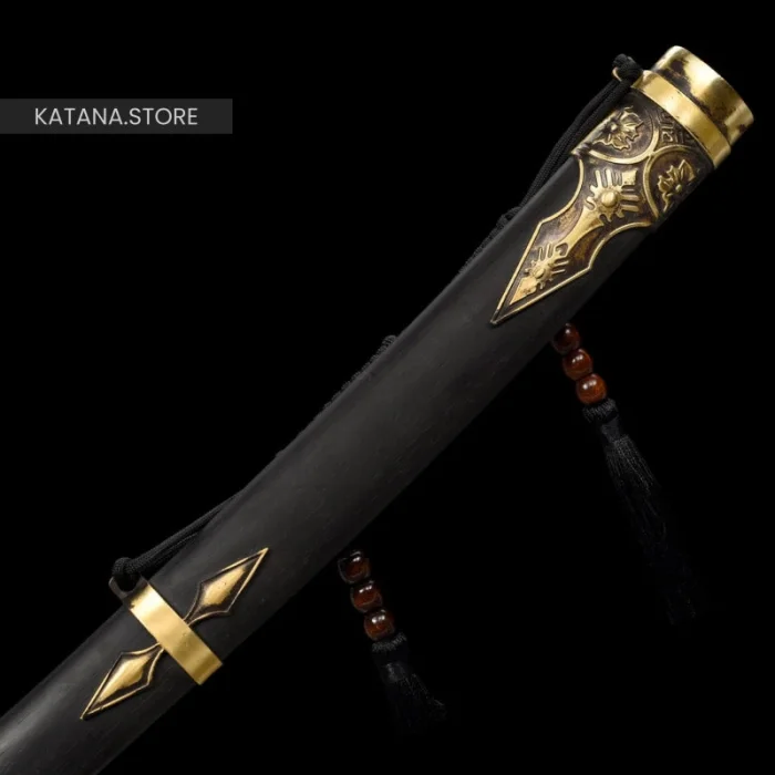 This blue and gold katana is appreciated for its unique beauty and craftsmanship. The blade of the sword is made from high-quality steel, with a distinctive blue colors and a gold habaki. The sword have golden patterns etched along the saya. The handle is crafted from either hardwood. The handle is wrapped with a black silk cord to add grip and balance when wielded.