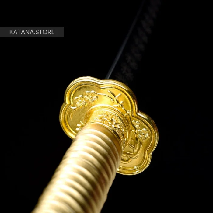 This golden katana is a true work of art. Its golden color and black blade contrast wonderfully for a breathtaking result. The handle of the katana is covered with a golden rope, and the tsuba in the shape of flowers is made of gold-plated alloy. A katana as impressive in its aesthetics, as it is sharp.