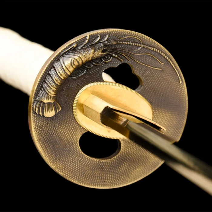What sets our Gold Tachi apart is its distinctive golden tsuba. Engraved with a lobster, a creature symbolizing longevity, strength, and regeneration, the tsuba adds a unique touch of charm to this already stunning piece. This intricately designed tsuba serves as the centerpiece of the sword, beautifully tying together the golden blade and handle.
