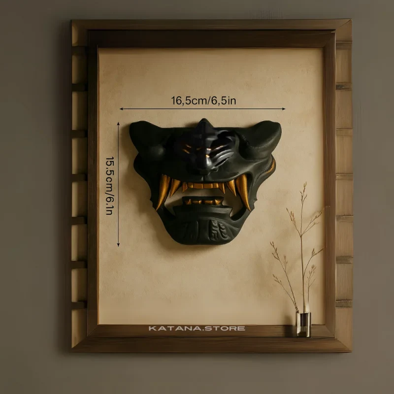 Measuring 16.5 cm (6.5 in) wide and 15.5 cm (6.1 in) tall, this wall mount combines robust design with authentic detail. The blackened finish gives it a shadowy, ancient look, while the golden teeth strike a bold contrast, creating a dramatic effect on any wall. Every curve, horn, and fierce expression has been carefully sculpted to capture the spirit of the mythical Oni.