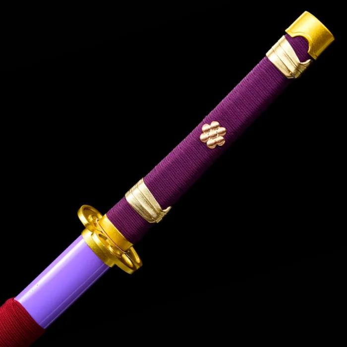 Balanced for practice, the katana’s lightweight design makes it an ideal choice for cosplay or display. The golden tsuba serves as a stunning contrast against the purple and black, making the sword pop visually whether it’s wielded in a cosplay performance or displayed in a case.